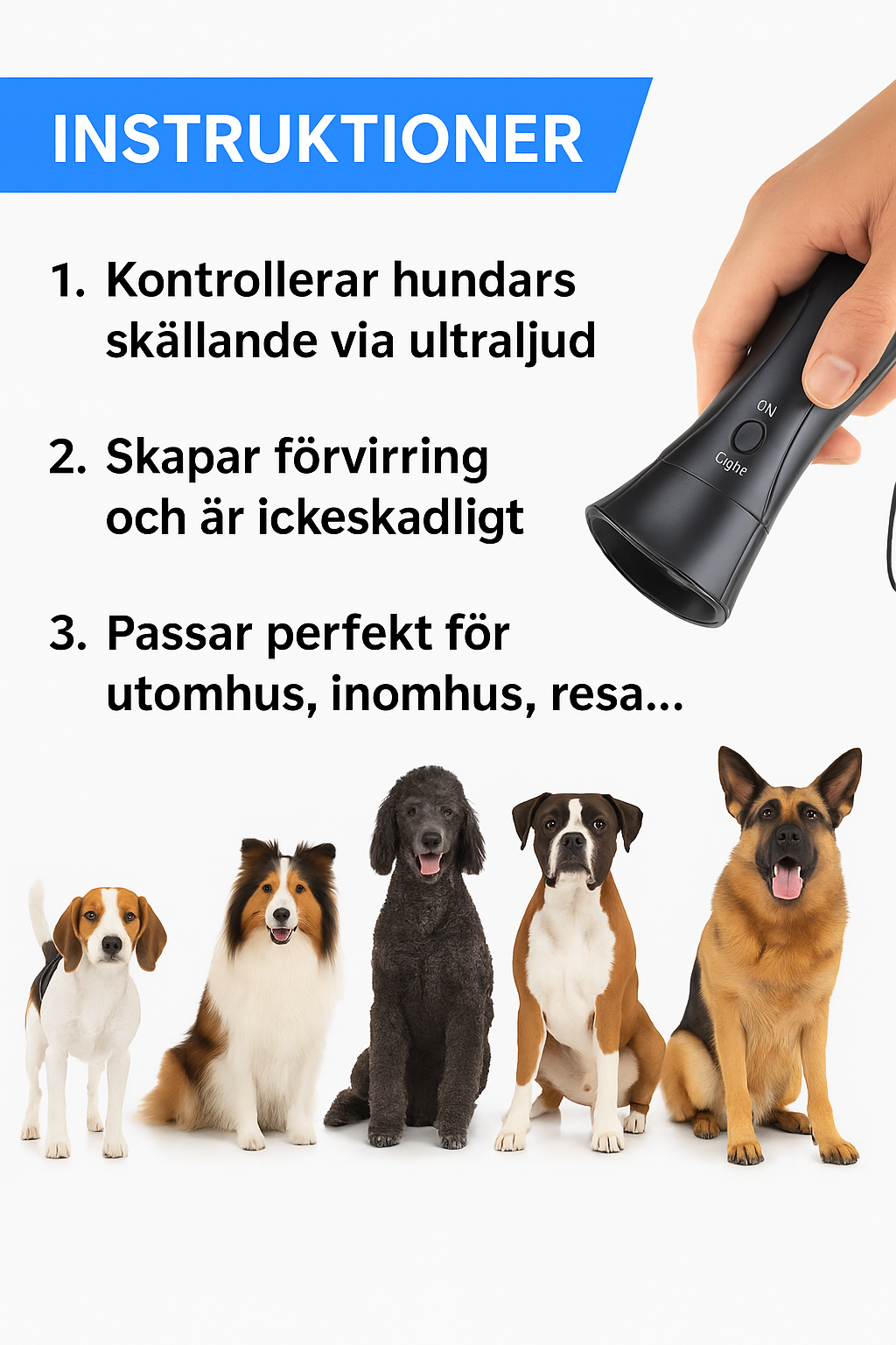 Utvecklad av en före detta militärhundtränare är IngetSkäll designad för att fånga hundars uppmärksamhet – även i situationer där de är överstimulerade. Det högfrekventa ljudet avbryter snabbt oönskat beteende och riktar hundens fokus mot dig, så att du enkelt kan träna in de rätta vanorna.
